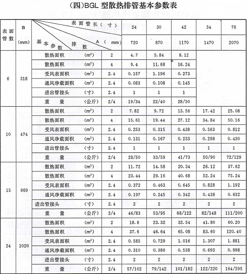 BGL型不銹鋼散熱排管,可分二排、四排、六排,當然也能制單排,以及其他非標形式,每種型號均有大小不同的規(guī)格,在此只標常規(guī)型號、規(guī)格。其中外殼、無縫不銹鋼管¢18×2m/m均用1Cr18Ni9Ti材料,其翅片管用鋁軋制而成,翅片管外徑為¢38mm,根徑為¢19mm,其片高為9.5mm,片距為R片(3m/m),翅片管呈螺旋狀。